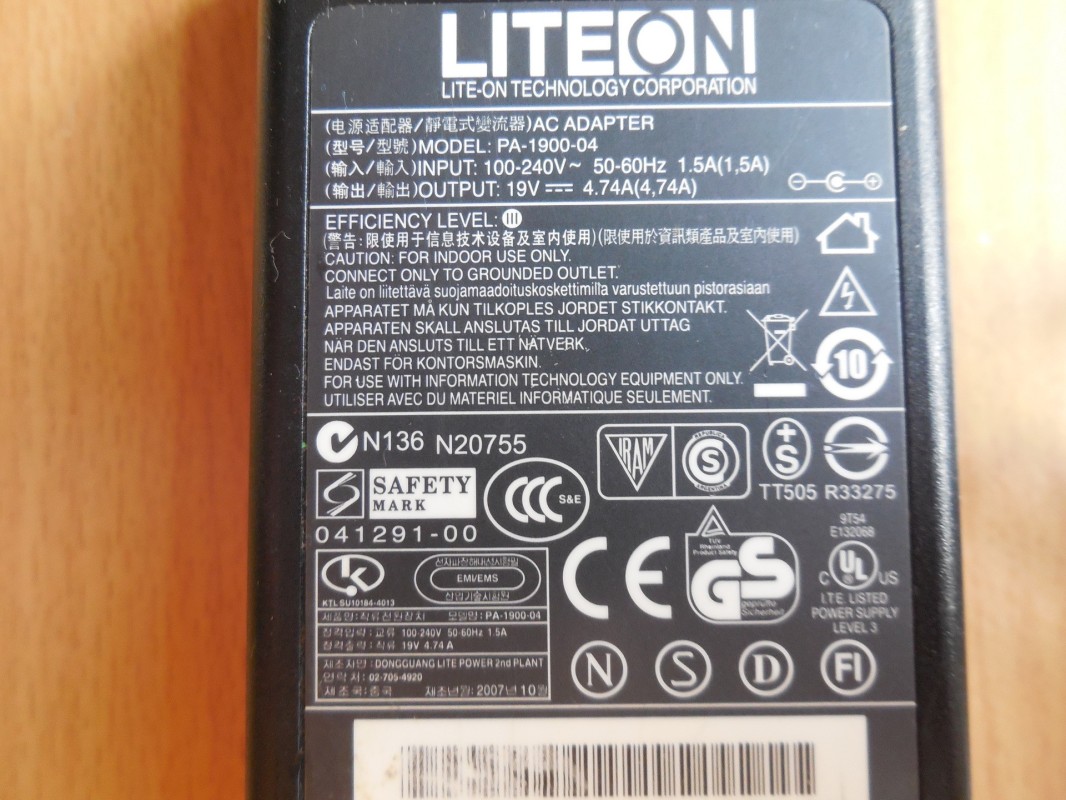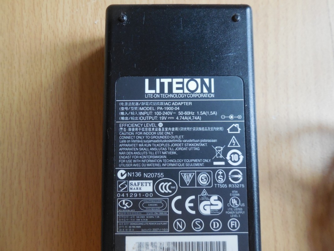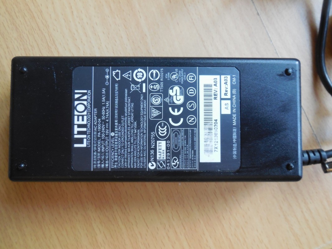 Napájecí adaptér LITEON PA-1900-04 je 90W zdroj s výstupním napětím 19 V a proudem 4,74 A. Je vybaven konektorem o rozměrech 5,5 x 2,5 mm.