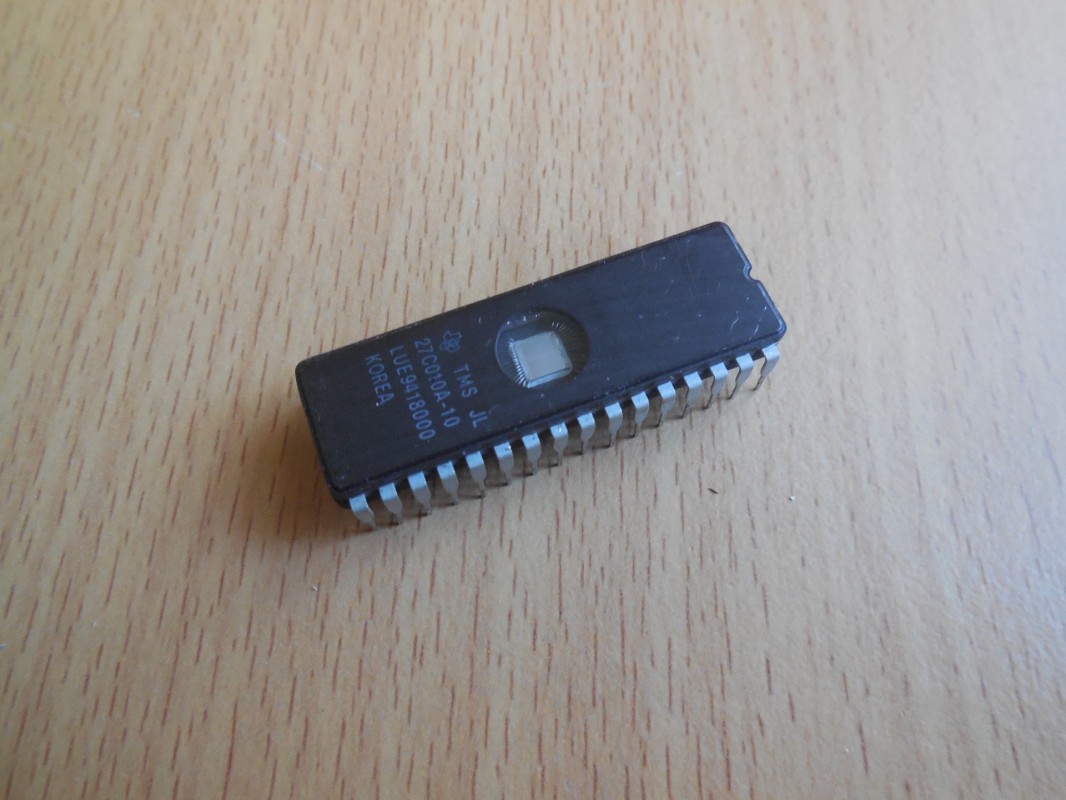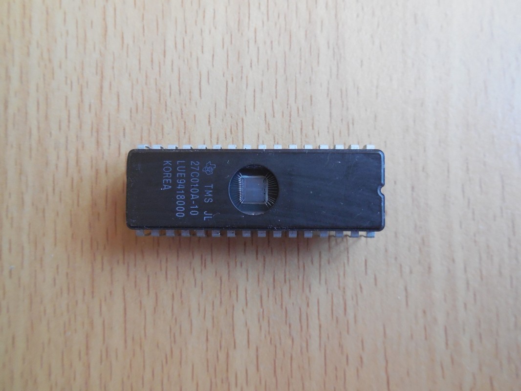 Čip Texas Instruments TMS27C010A-10 je 1 Mbit (128K x 8) UV mazatelná programovatelná paměť pouze pro čtení (EPROM).