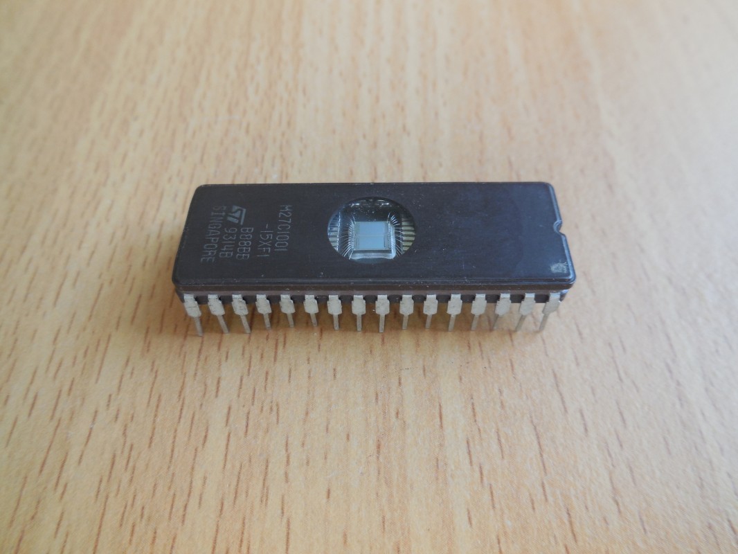 Tento konkrétní model M27C1001 pochází z 90. let a byl vyráběn v Singapuru. Pravděpodobně pochází z nějakého staršího elektronického zařízení.