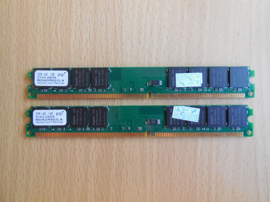 Paměťové moduly PQI DDR-400 1GB (MDADR602LA), které se používaly ve stolních počítačích přibližně mezi lety 2003 – 2006.