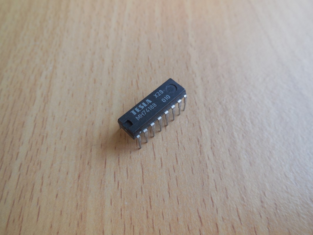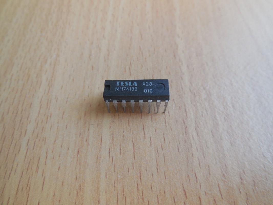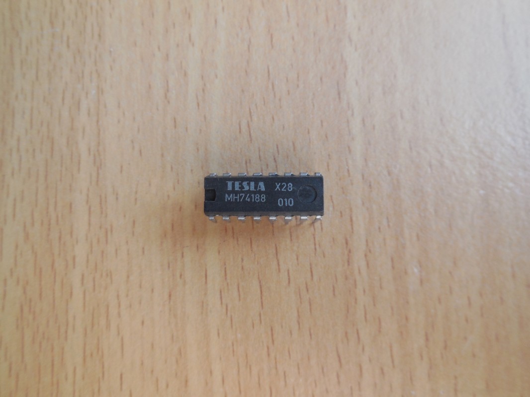 Integrovaný obvod TESLA MH74188. Tento čip je programovatelná paměť PROM (Programmable Read-Only Memory), což znamená, že do něj lze jednou naprogramovat data, která pak zůstávají uložená.