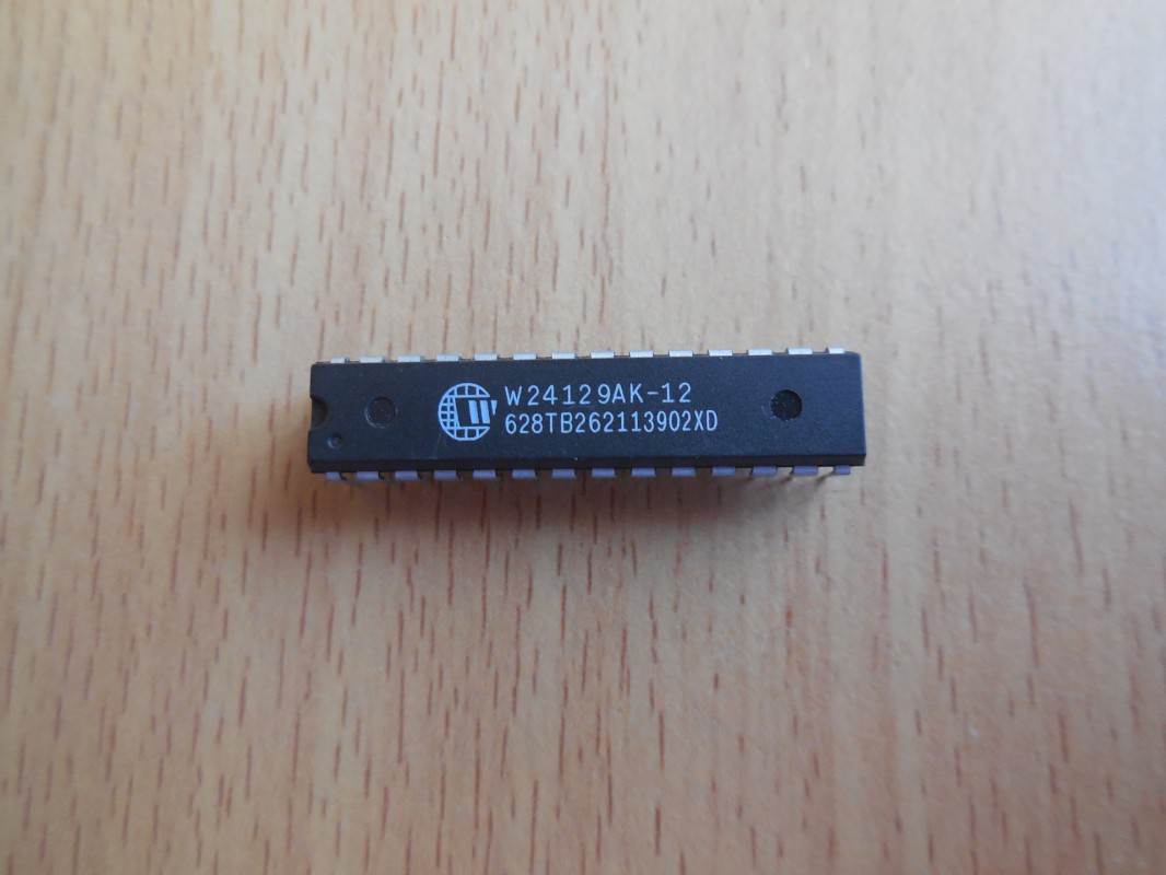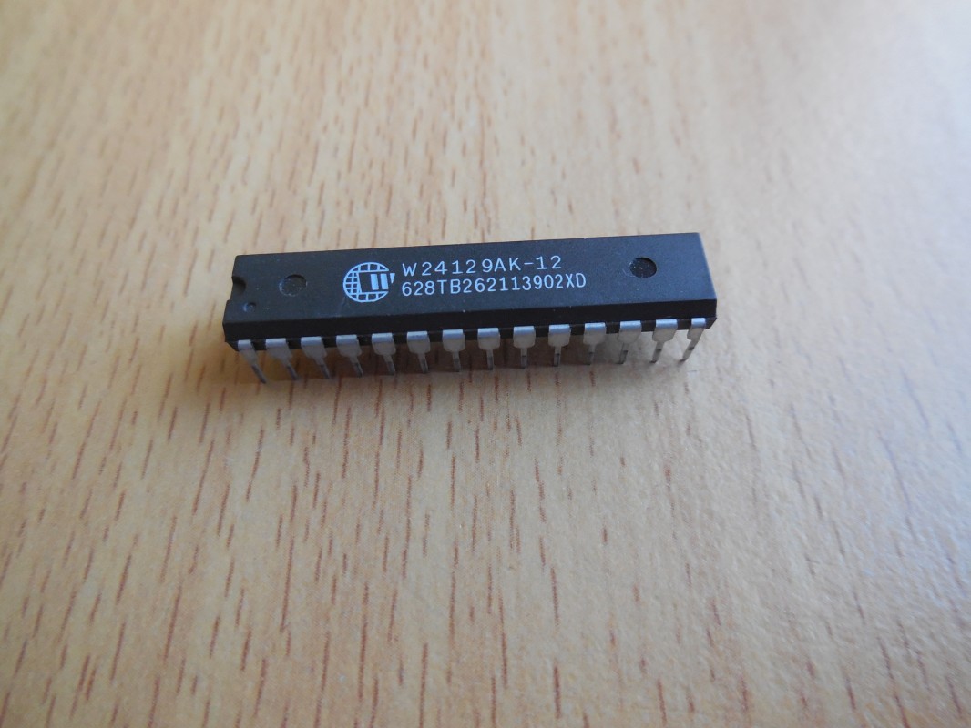 Integrovaný obvod W24129AK-12 od společnosti Winbond. Jedná se o statickou RAM, což znamená, že na rozdíl od DRAM nepotřebuje pravidelné obnovování dat. Tento typ paměti se často používal v starších počítačích, vestavěných systémech, nebo pro ukládání dočasných dat v různých elektronických zařízeních.